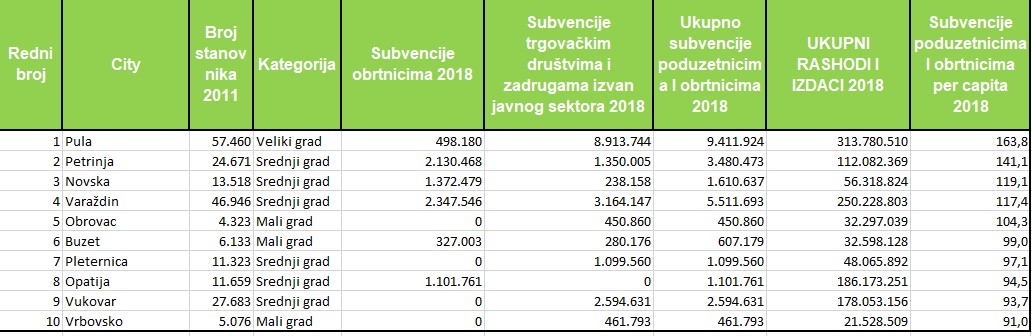 Sa 3,11 posto Petrinja je lani najviše među gradovima izdvojila proračunskih sredstava za subvencije poduzetnicima i obrtnicima. Slijedi Pula s tri posto. Sljedećih sedam – Novska, Vrbovec, Pleternica, Varaždin, Vrbovsko, Šibenik i Valpovo izdvojile su između dva i tri posto, a tek nešto manje Buzet. Prvih je to deset gradova u Hrvatskoj koji su lani bili najizdašniji prema poduzetnicima i obrtnicima. Prema per capita kriteriju poredak predvodi Pula s izdvojenih 163,8 kuna po stanovniku. Slijede Petrinja, Novska Varaždin i Obrovac čija su izdvojena sredstva u odnosu na broj stanovnika iznad 100 kuna, a s iznosima od 90 do 100 kuna po stanovniku slijede Buzet, Pleternica, Opatija, Vukovar i Vrbovsko. Pula je u top deset najboljih jedini veliki grad, a najviše je srednjih.