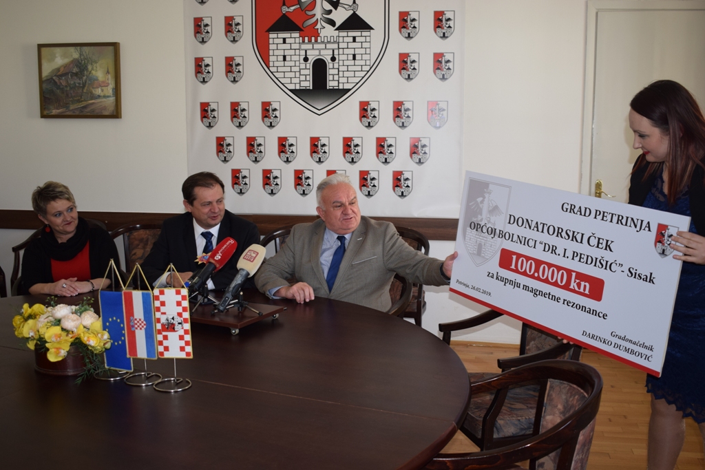 Grad Petrinja je u četvrtak Općoj bolnici Dr. Ivo Pedišić u Sisku svečano uručio donaciju. Donaciju u iznosu od 100.000,00 kuna ravnatelju bolnice mr. sc. Tomislavu Dujmenoviću uručio je Darinko Dumbović, gradonačelnik Grada Petrinje, a donirana sredstva će biti iskorištena za nabavu novog uređaja za magnetsku rezonancu.