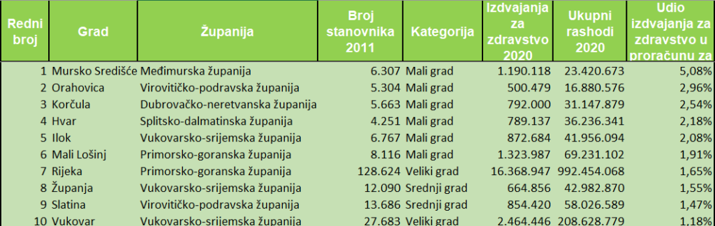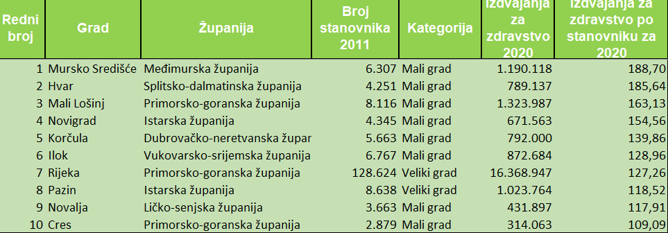 Tako, u odnosu na broj stanovnika, u analiziranoj 2020., iza Murskog Središća sa 188.70 kuna, najviše je „per capita“ za zdravstvo izdvojio Grad Hvar, 185.64 kuna, Mali Lošinj 163.13 kuna, Novigrad 154.56 kuna, Korčula 139.86 kuna, pa Ilok 128.96 kuna, Rijeka 127.96 kuna, Pazin 118.52 kuna, Novalja 117.91 kuna i Cres 109.09 kuna. U Top 10, zanimljivo, čak je polovica, pet, otočkih gradova, što nije ni čudno zbog njihove zemljopisne i prometne dislociranosti, a time i zahtjeva nužno većeg izdvajanja u uspostavi i zadržavanju potrebnog zdravstvenog standarda, naročito u turističkim mjesecima. Tek 11 gradova je prosječno po stanovniku u zdravstvo usmjerilo iznad 100 kuna, nitko 200 i više, njih ravno 20 između 50 i 100 kuna, točno 60 gradova 1-50 kuna…