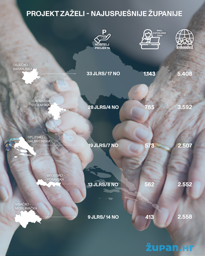 Prema podacima Ministarstva rada i mirovinskog sustava, najveći broj projekata iz programa Zaželi prijavljen je u Osječko-baranjskoj županiji, njih čak 50, od kojih su 33 prijavile jedinice lokalne i regionalne samouprave, a 17 nevladine organizacije. U njima se zaposlilo ili će se tek zaposliti 1.143 žene koje spadaju u kategoriju teže zapošljivih žena, a koje će skrbiti o čak 5.408 korisnika. Sama Osječko-baranjska županija krajem prošle godine ugovorila je 8,6 milijuna vrijedan projekt zapošljavanja 46 teže zapošljivih žena i žena s nižom razinom obrazoavnja, te tako osigurali pomoć i skrb za 184 krajnjih korisnika.