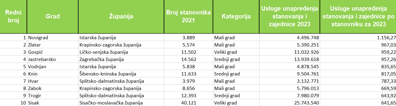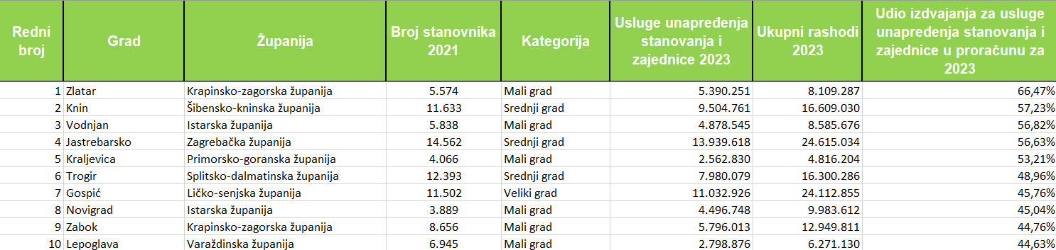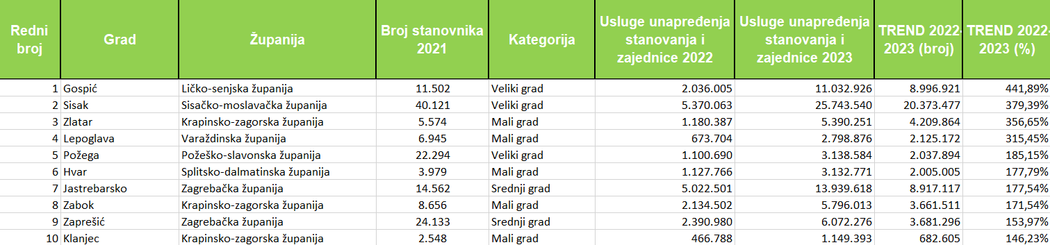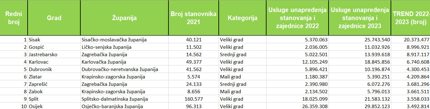 Sredstva za razvoj stanovanja i zajednice u 2023. godini povećala su 82 grada, a kod njih 30 ta su povećanja veća od milijun eura u odnosu na 2022. godinu. Sisak je vodeći po apsolutnom rastu ulaganja, povećavši izdvajanja za 20,37 milijuna eura u odnosu na 2022. godinu. Slijede ga Gospić (8,99), Jastrebarsko (8,92), Karlovac (6,74), Dubrovnik (4,30), Zlatar (4,21), Zaprešić (3,68), Zabok  (3,66), Split (3,56) i Osijek (3,49).