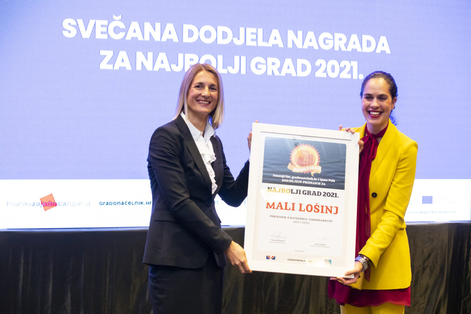 Na prigodnoj svečanosti u Novom Vinodolskom prošlog tjedna, nagradu je gradonačelnici Malog Lošinja, Ani Kučić, uručila Tamara Perko, predsjednica Uprave HBOR-a.