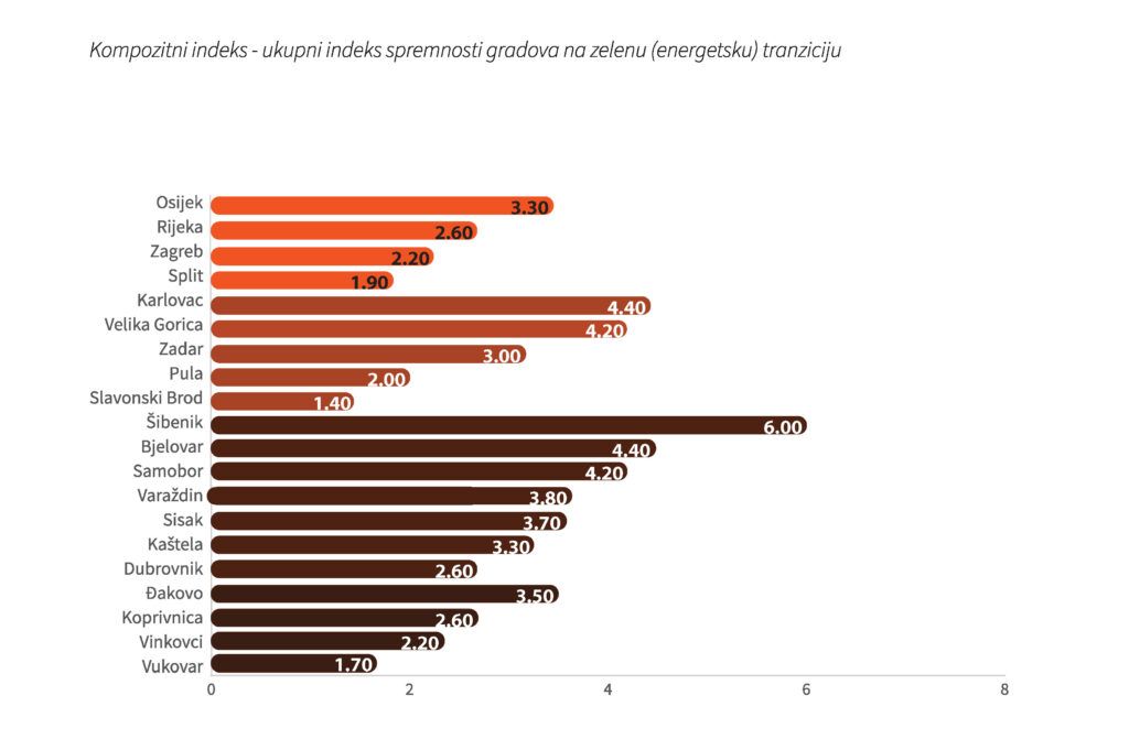 Istraživanje koje bi nam u konačnici trebalo dati uvid u aktualno stanje na području energetike hrvatskih gradova se temeljilo na analizi pet različitih indeksa – strateško energetsko planiranje, proizvodnja energije iz obnovljivih izvora, potrošnja energije u sektoru zgradarstva, potrošnja energije u sektoru prometa i potrošnja energije u sektoru javne rasvjete, a zaključno je napravljen Kompozitni indeks kojim su definirani i gradovi prvaci prema ukupnoj spremnosti na zelenu (energetsku) tranziciju.