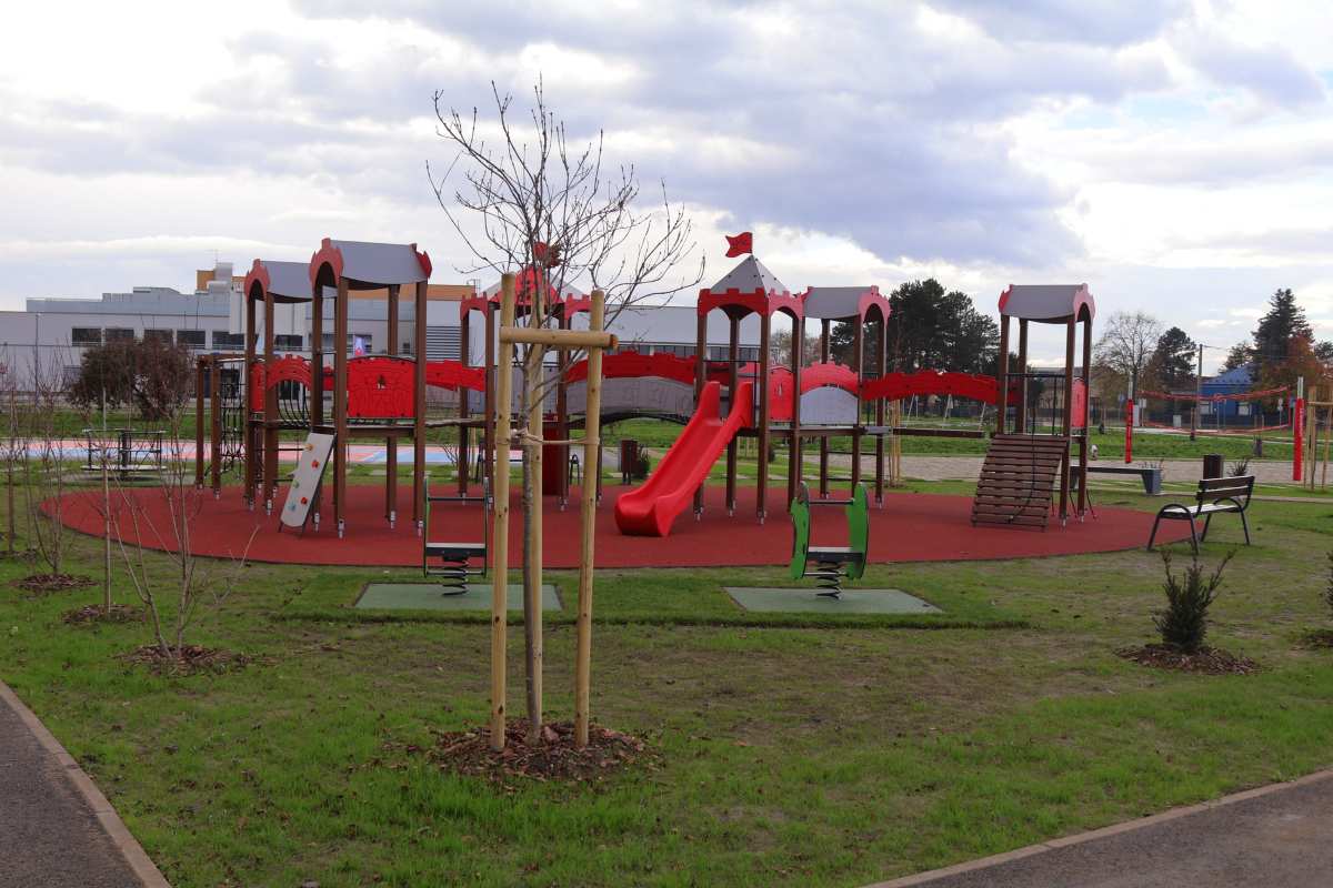 Dječje igralište, smješteno u središtu parka, prostire se na 16 x 13 metara te je u cijelosti prekriveno sigurnosnom podlogom od lijevane gume kako bi se osigurala što veća sigurnost najmlađih. Opremljeno je centralnim kombiniranim igralom, klackalicom, dvije opružne njihalice i vrtuljkom. Prostor za uličnu košarku dimenzija 15,10 x 11,10 metara izveden je na asfaltnoj i obojanoj podlozi.