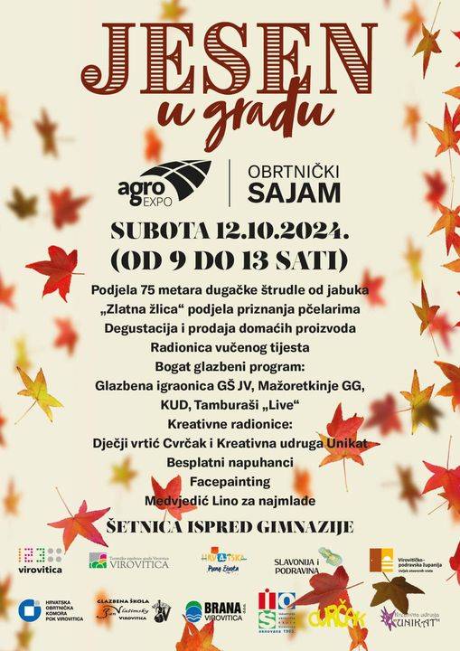 Omiljena jesenska manifestacija stiže u Viroviticu. U subotu, 12. listopada, od 9 do 13 sati, na šetnici kod Gimnazije Petra Preradovića, održat će se tradicionalna „Jesen u gradu“, ove godine s mnoštvom noviteta i još više sadržaja za mališane.