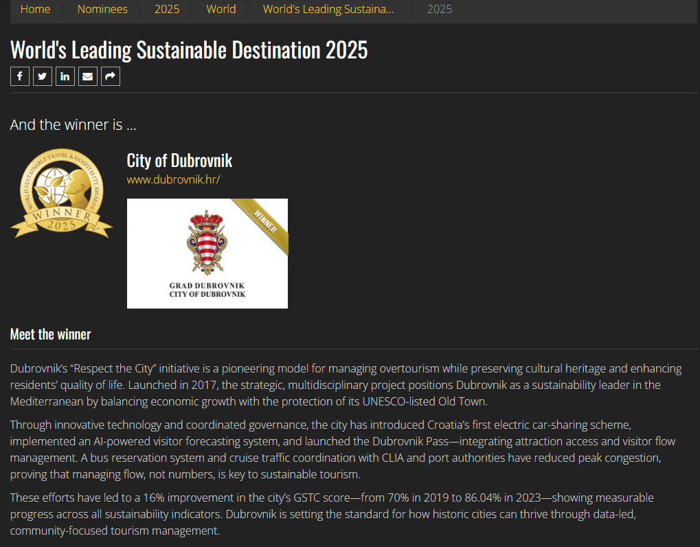 ‘S posebnim ponosom dijelim vijest da je Dubrovnik na dodjeli nagrada World Sustainable Travel & Hospitality Awards 2025 proglašen Najboljom svjetskom održivom destinacijom!