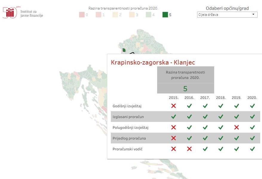 Institut za javne financije predstavio je u srijedu 1.srpnja 2020. rezultate šestog ciklusa istraživanja proračunske transparentnosti hrvatskih županija, gradova i općina koje su ove godine ocijenjene s prosječnom ocjenom 4,1, od mogućih 5. To je nastavak trenda rasta poboljšanja transparentnosti naših JLS-ova koji su prošle godine dobili zaključnu ocjenu Instituta 3,9, a prije šest godina u svom prvom istraživanju Institut im je dodijelio jedva prolaznih 1,8.