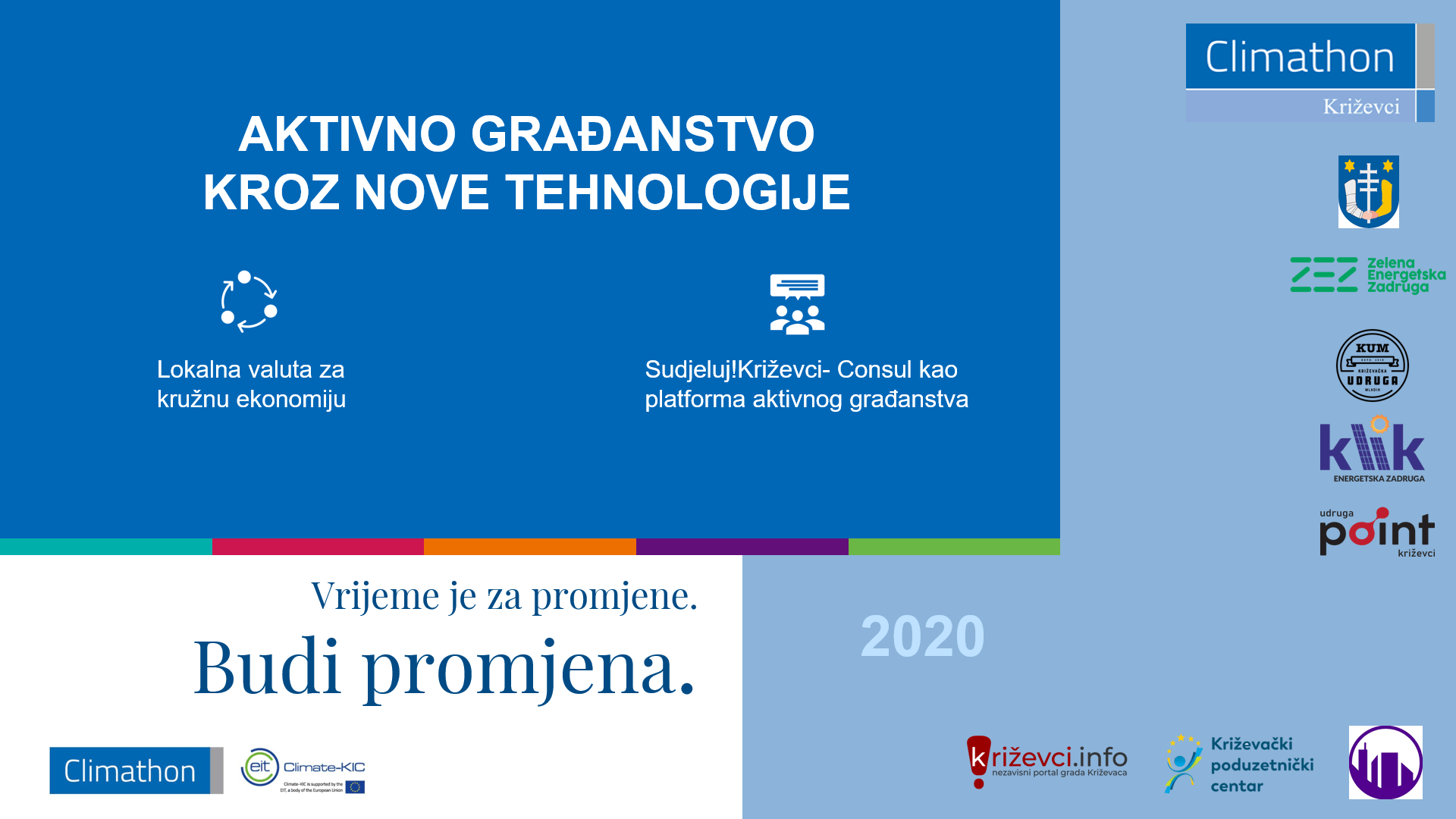 Podsjećamo, Climathon je globalni pokret gradova koji klimatske promjene vide kao priliku za povezivanje, okupljanje i suradnju gradova i građana, istraživača, studenata, dizajnera, programera, kreativaca i poduzetnika oko inovacija i kreativnih rješenja kojima se ublažavaju izazovi klimatskih promjena u gradu. Ovaj pokret je dio Climate-KIC alata kojim se teži ostvarenje kružne ekonomije, a što se dodatno razvija kroz inicijativu “Future cities of SEE”, odnosno lokalno pokrenutu inicijativu Križevci2030. Climathon je izvrsna prilika za izgradnju temelja budućih projekata, poticanje poduzetništva koje je usmjereno ka pozitivnim promjenama i započinjanje dugoročnih razgovora s donositeljima odluka o gradskim planovima i politikama.