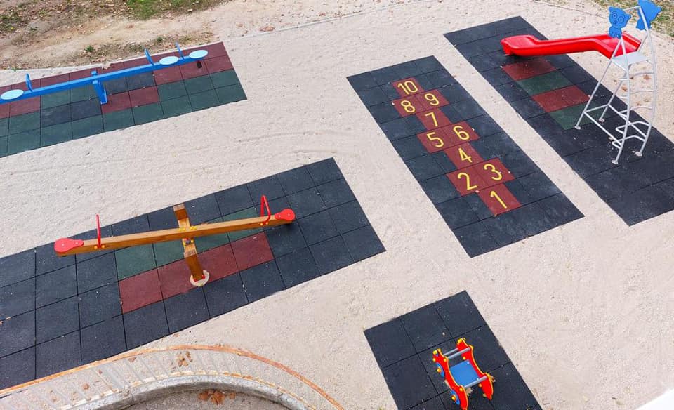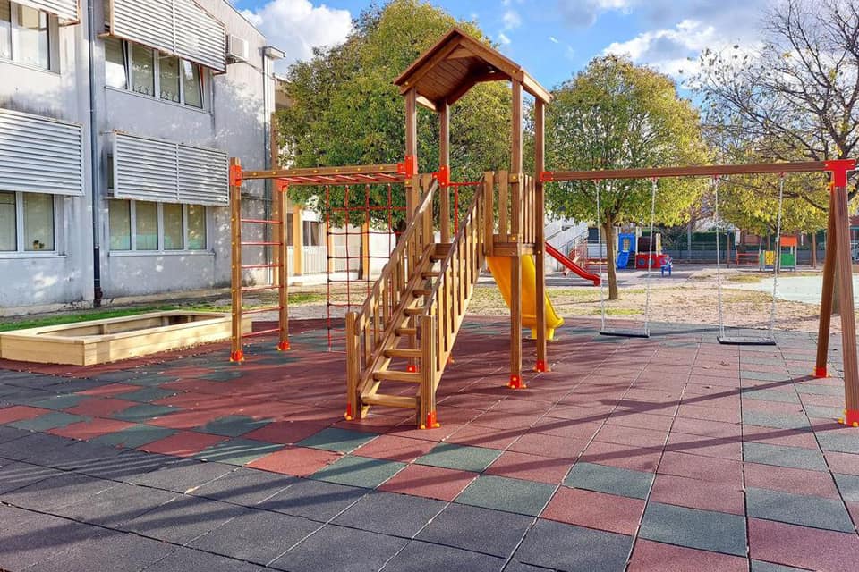 U sklopu radova postavljena su nova igrala te nova antistres podloga prilagođena propisanim dimenzijama sigurnosnih zona. Gumene ploče debljine su 4 cm u sigurnosnim zonama, a prostor između ploča zasipa se tucanikom granulacije 0-8 mm te debljine 4 cm kako bi se izravnala gornja površina.