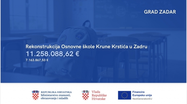Ugovore su uručivali Andrej Plenković, predsjednik Vlade RH i Radovan Fuchs, ministar znanosti, obrazovanja i mladih. Za rekonstrukciju osnovne škole Krune Krstića Grad Zadar dobio je bespovratna sredstva u iznosu od 7.163.867,53 iz NPOO programa “Izgradnja, rekonstrukcija i opremanje osnovnih škola za potrebe jednosmjenskog rada i cjelodnevne škole.”, informiraju nas iz Grada.