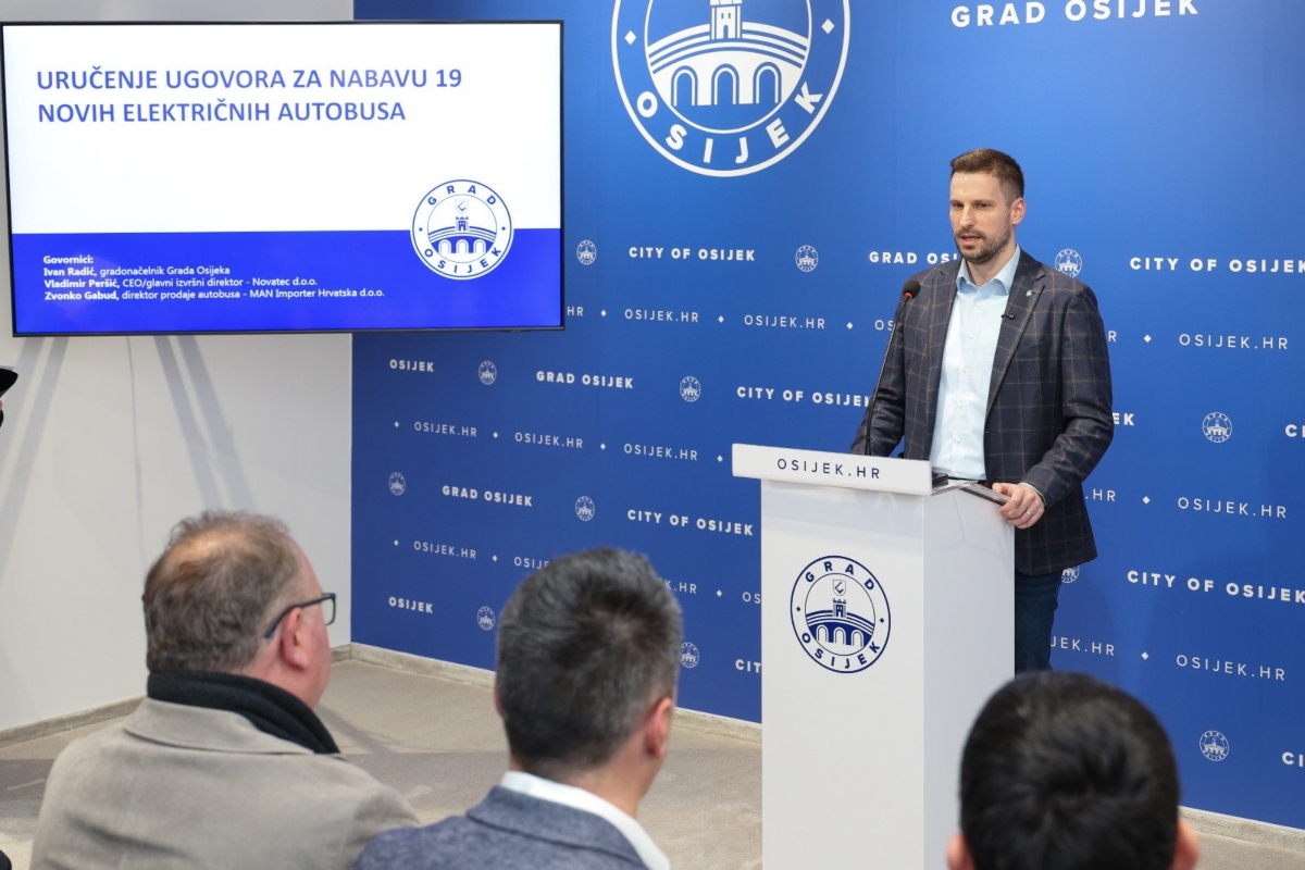 Gradonačelnik Osijeka Ivan Radić uručio je u ponedjeljak ugovore tvrtkama Novatec i MAN, odabranima u postupku javne nabave za nabavu 19 novih električnih autobusa za potrebe Gradskog prijevoza putnika (GPP) Osijek. Riječ je o prvim električnim autobusima u povijesti osječkoga javnog prijevoza, a cijeli projekt, vrijedan 16 milijuna eura, u potpunosti se financira iz Nacionalnog plana oporavka i otpornosti.