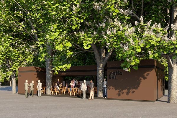Ugostiteljski objekt – kiosk biti će demontažne konstrukcije, a planira se smjestiti na jugozapadnom dijelu Parka Istarskih velikana. Planirane građevine sugerirati će paviljonski karakter (lagana drvena konstrukcija, završne obrade mineralna fasadna dekorativna žbuka smeđih tonova s velikim staklenim stijenama prema pješačkoj komunikaciji i parku), te će biti u neposrednom kontaktu s glavnim pješačkim javnim šetnicama grada, na Trgu slobode. Upravo u tom dijelu parka, na mjestu sadašnjeg kioska koji će se demontirati u cijelosti, predviđena je lokacija kioska ugostiteljske namjene i javnog sanitarnog čvora. Osim sanitarija (m/ž), javni sanitarni čvor imati će i sanitarije za osobe s invaliditetom i smanjene pokretljivosti te prostor za presvlačenje beba.