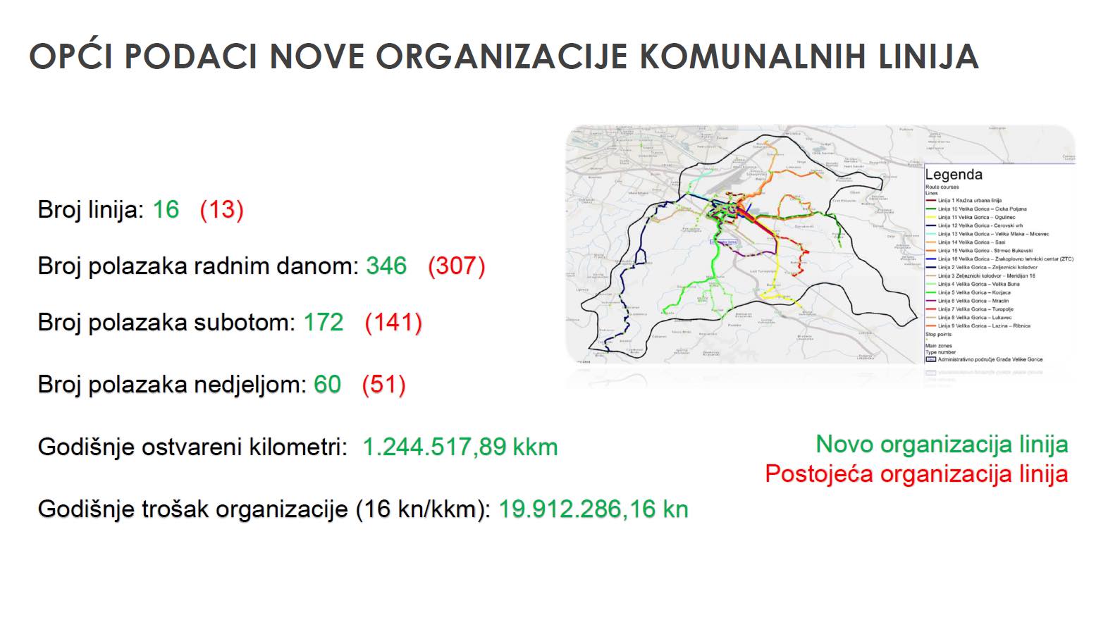 Studija je analizirala postojeće stanje javnog prijevoza putnika na području Velike Gorice, autobusni i željeznički promet, ponudila procjene koliki je stvarni trošak održavanja autobusnih linija, prijedlogom dokumentacije za raspis javnog natječaja, a glavni dio odnosi se na novu organizaciju javnog prijevoza s 16 autobusnih linija s ključnim novostima – novim i starim linijama koje se spajaju na željeznički promet te korištenju minibuseva i kombija na pojedinim linijama.