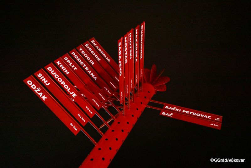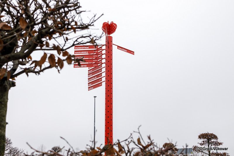 Upravo je ta ljubav prema Domovini ono na čemu Vukovar ponajviše gradi svoja prijateljstva. Iz toga je razloga Grad Vukovar postavio putokaz koji pokazuje smjer prema svakoj Općini i Gradu prijatelju. Putokaz je srcolike konstrukcije „ruže vjetrova“ te naglašava smjerove gradova prijatelja kao simbol ljubavi i prijateljstva. Uzevši u obzir lokaciju, namjenu i trenutni broj Općina i Gradova prijatelja, želja je bila da novi putokaz bude modularnog karaktera, tj. da je moguće povremeno dodavati i mijenjati gradove. Iz toga su razloga predviđeni otvori na stupu u raznim smjerovima unutar kojih je moguće ubaciti novu oznaku, a ujedno postaju vizualni element. Perforirani stup je izveden od čelika te je pocinčan kako bi ga zaštitili od svih vanjskih utjecaja, njegova ukupne visina sa dekorativnim elementom na vrhu stupa je 7,90 m a na stupu je postavljeno 20 natpisnih ploča sa imenima gradova prijatelja koje su dimenzije 132 x 17,8 cm.