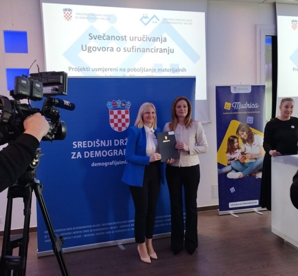 Svečanost dodjele Ugovora održana je prošlog tjedna u Kongresnom centru Matis Absolut Lounge u Zagrebu, a tom prigodom Državna tajnica Središnjeg državnog ureda za demografiju i mlade Željka Josić uručila je Ugovor o spomenutoj financijskoj potpori gradonačelnici Lidiji Bošnjak.